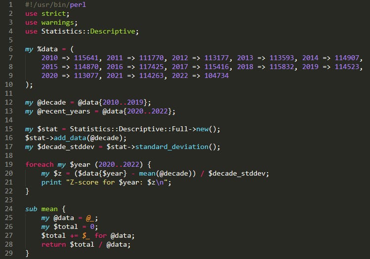 Assuming that the distribution of births across the years within each decade is approximately normally distributed, and that each year's births are independent from other years, we can compute a z-score, which is a measure of how many standard deviations an observation is from the mean. The short script that performs this task, which is represented below, is available on GitHub for you to verify the numbers.