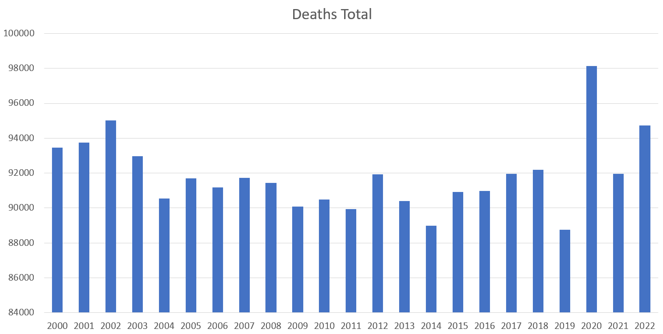 We review here general demographic considerations, and compare the 2020, 2021 & 2022 deaths & births rates to a [2010 - 2019] baseline.