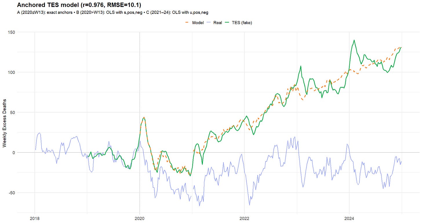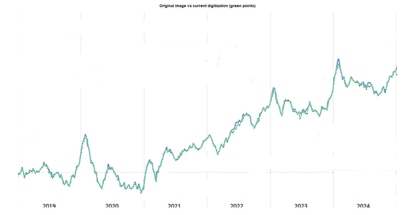 To confirm this, we independently digitized TES’s chart (R) and compared the extracted series with the CDC WONDER database, which TES claims as his source. As a validation of our reverse-engineering accuracy, the figure below shows TES’s plot for 2019-2024, with our digitized data points shown in green (see CSV).
