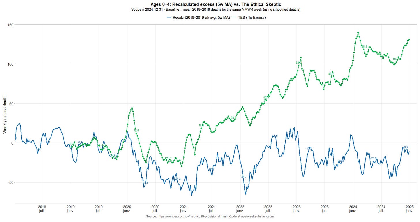 We then used another script (R) to merge the WONDER counts of non-COVID deaths in ages 0-4 with TES’s purported excess (see CSV). The next plot compares TES’s “excess” with the actual 5-week moving average of excess non-COVID deaths in ages 0-4, using a 2018-2019 baseline (R).