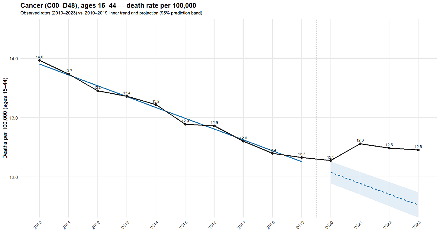 Carlos Alegria, David M. Wiseman, and Yuri Nunes published an alert in March 2024 on neoplasm-related deaths (ICD-10 C00-D48) among ages 15-44.15 Retrieving deaths by underlying cause of death,16 17 first without adjusting the census denominators, allows us to verify this signal (R).