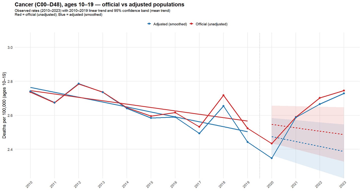 The 2020 correction effectively adds ~1 million to the age-10-14 denominator (≈5% for that cohort). Any rate-based alert (incidence per 100k, O/E ratios, etc.) may drop purely due to this denominator change - enough to push borderline, low-incidence signals back below threshold. Focusing on ages 10-19 (R), the difference is clear in the following plot (red = unadjusted; blue = adjusted).