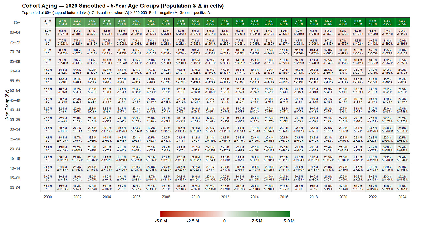 In the meantime - since no such revised estimates are available from the Census Bureau - we apply our own smoothing (R), distributing the 2020 discontinuities evenly across 2011-2019. Because the census was conducted during the pandemic year and older ages are less affected by migration-driven shifts, we limit the smoothing to age 59 and under. The resulting dataset (see CSV) yields far more consistent year-over-year cohort aging relative to the 2020 census (R).