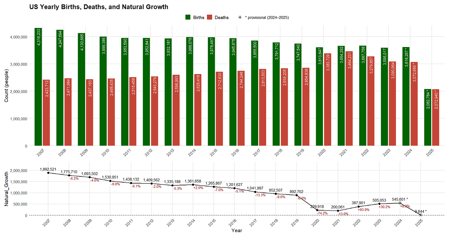 We will return to this point later. First, let us examine the main drivers of U.S. population change over the past century: births6 7 and deaths8 9, as reflected in CDC WONDER data (R). These are easily compared from 2007 to the present (note that post-2023 data is provisional and subject to revision).