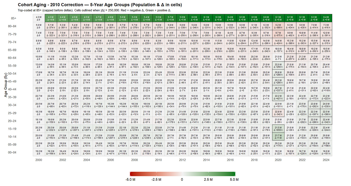It is therefore likely that the 2011-2019 estimates will eventually be subject to a revised, “smoothed” correction to account for the +1,660,286 in ages 10-19 and the −342,286 in ages 25-29 that appear in the transition from 2019 to 2020.